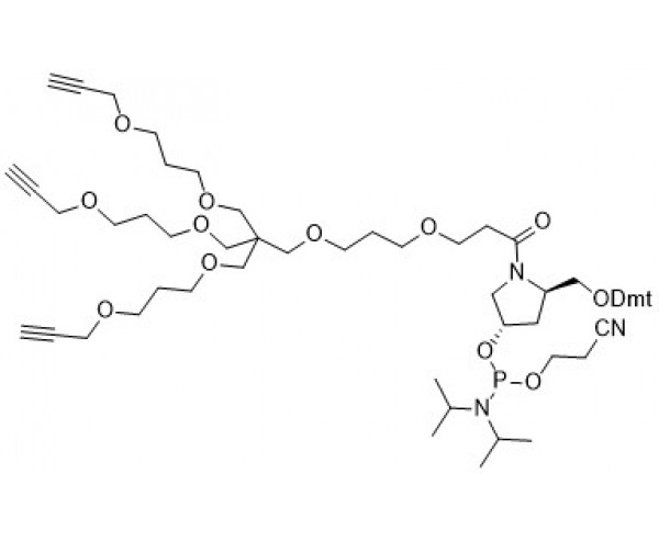 5-((bis(4-methoxyphenyl)(phenyl)methoxy)methyl)-1-(10-((hept-6-yn-1-yloxy)methyl)-10-((3-(prop-2-yn-1-yloxy)propoxy)methyl)-4,8,12,16-tetraoxanonadec-18-ynoyl)pyrrolidin-3-yl (2-cyanoethyl) diisopropylphosphoramidite |